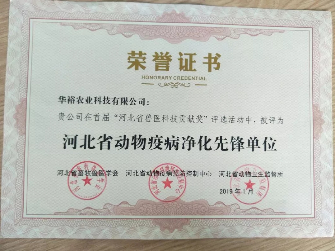 2018年,在河北省組織的首屆“河北省獸醫(yī)科技貢獻獎”評選中,華裕農(nóng)業(yè)科技有限公司被評為“河北省動物疫病凈化先鋒單位”。