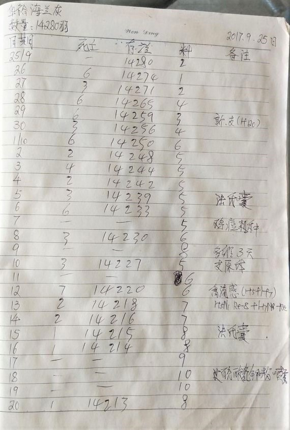 這是2017年9月25日從華裕公司引種海蘭灰14280羽,體重、均勻度良好,30日齡時成活率99.3%,各項生產指標良好。