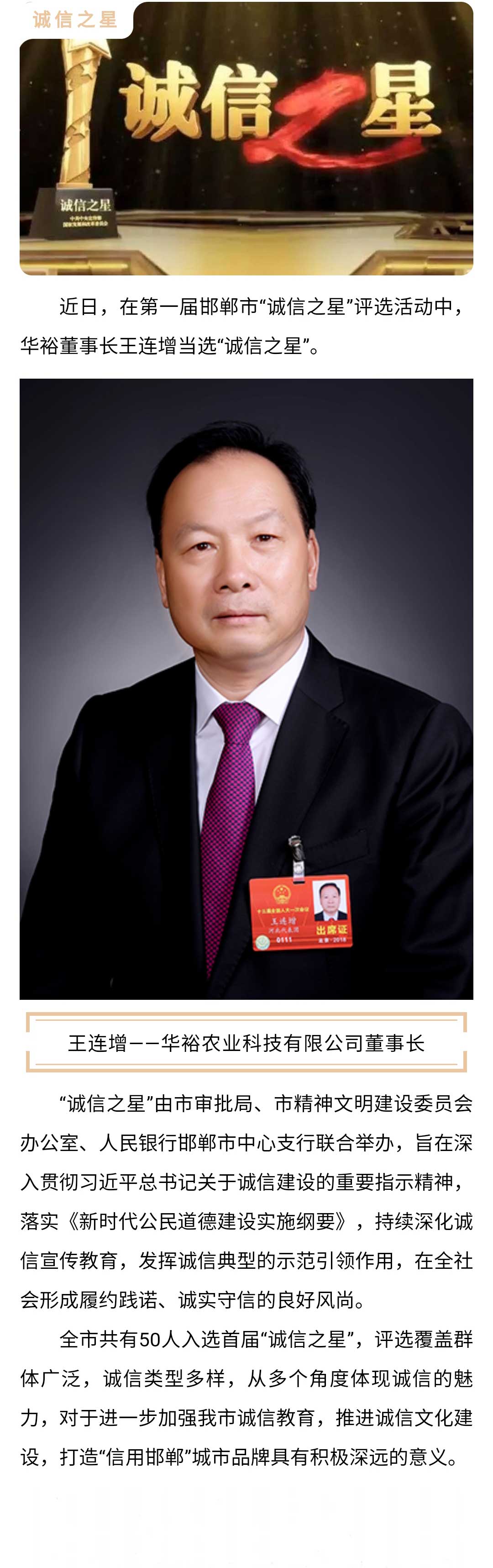 喜訊!華裕董事長(zhǎng)王連增當(dāng)選邯鄲市首屆“誠(chéng)信之星”