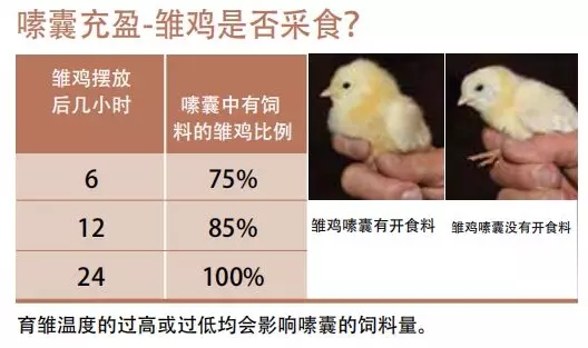4、良好綜合的飼養管理是保證一日齡雞群嗉囊充盈率達標的保障,縮短放雞時間避免冷應激、避免熱應激、提供舒適的溫度濕度條件、擁有較強的光照亮度、合理的密度和充足的水位料位供應,合適的水溫高營養易消化的雛雞開口料。