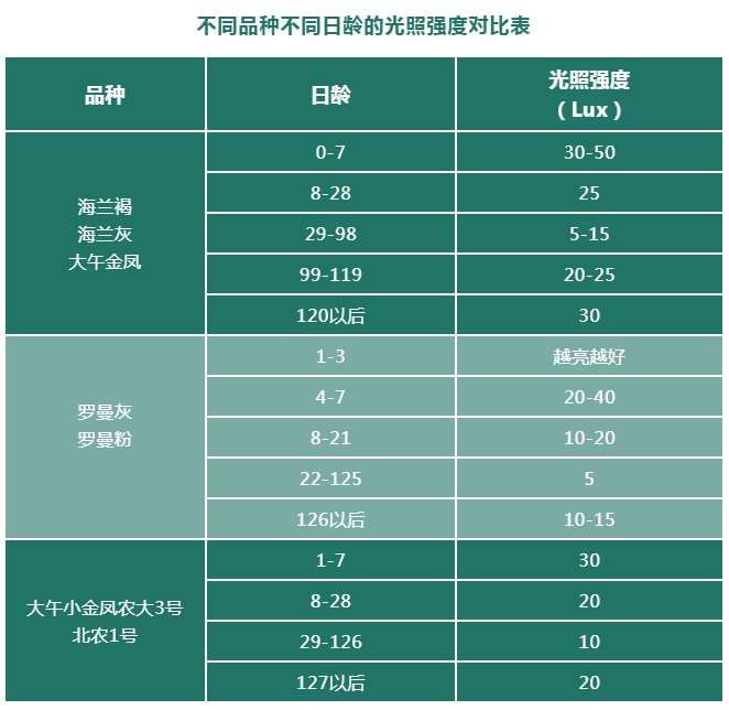 不同品種不同日齡的光照強度對比表